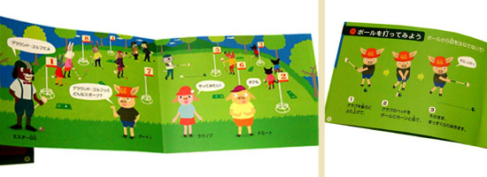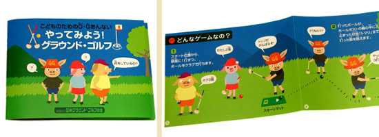 社団法人日本グラウンド・ゴルフ協会のこどものためのパンフレットを制作。デザイン、イラスト、アートディレクションを行いました。3びきのこぶたのキャラクターが、GGを体験しながら学んでゆく内容です。書籍「GoGo グラウンド・ゴルフ」にセットで販売他、用途によって配布されていました。24p